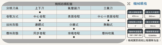 基本放料形式:有軸連體式機(jī)座,可放三種不同材料,進(jìn)行貼合后分條卷取。